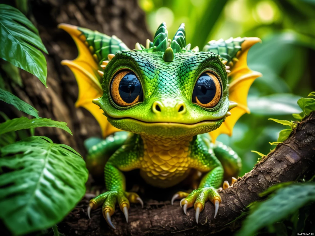blue eyes that convey a sense of whimsy and charm. The dragon is perched on a wooden branch, surrounded by lush foliage which suggests a natural