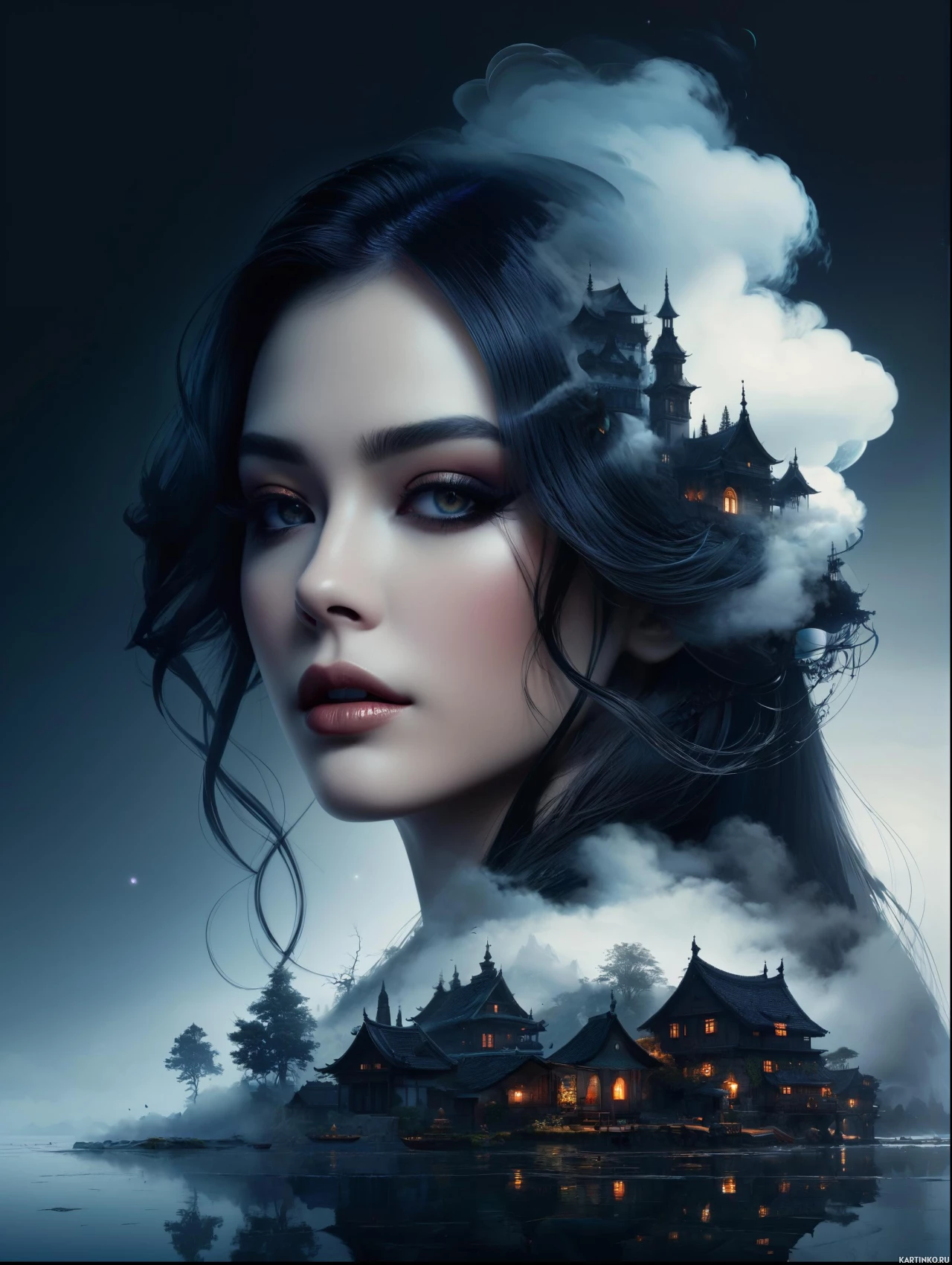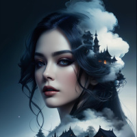 dark clouds and illuminated by lightning bolts. To the left of her face, there is an artistic depiction of smoke or mist that is being blown towards her, enhancing the ethereal quality of the image. In the background behind her head, a small tree can be seen, suggesting she might be in a peaceful,