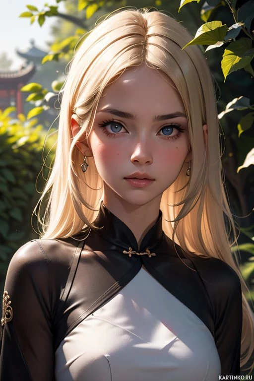 a serene setting with natural elements such as trees, grass, and possibly flowers or shrubbery, which contrasts with the darker tones of her clothing. The image is well-drawn, indicating it could be from an animated series, a video game, or a piece of concept art for these mediums.