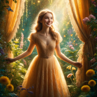 loose waves and she has a joyful expression on her face, as if she's smiling broadly towards something or someone not in view. She is standing in front of a large archway made from vines and green foliage, suggesting an entrance to a secret garden or