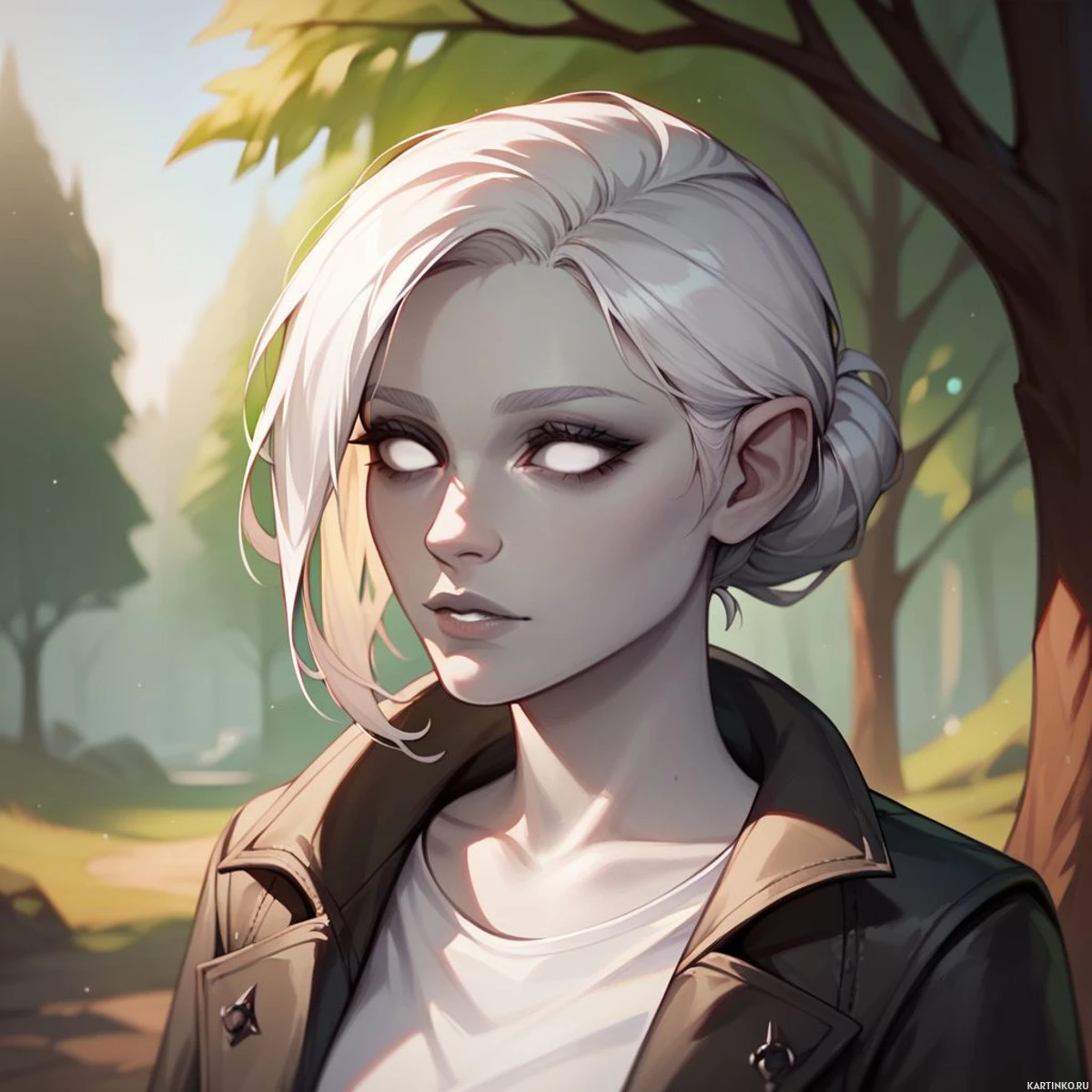 a female character with white hair, wearing makeup that accentuates her eyes and has a gentle expression. She is depicted in a realistic style with attention to detail in her