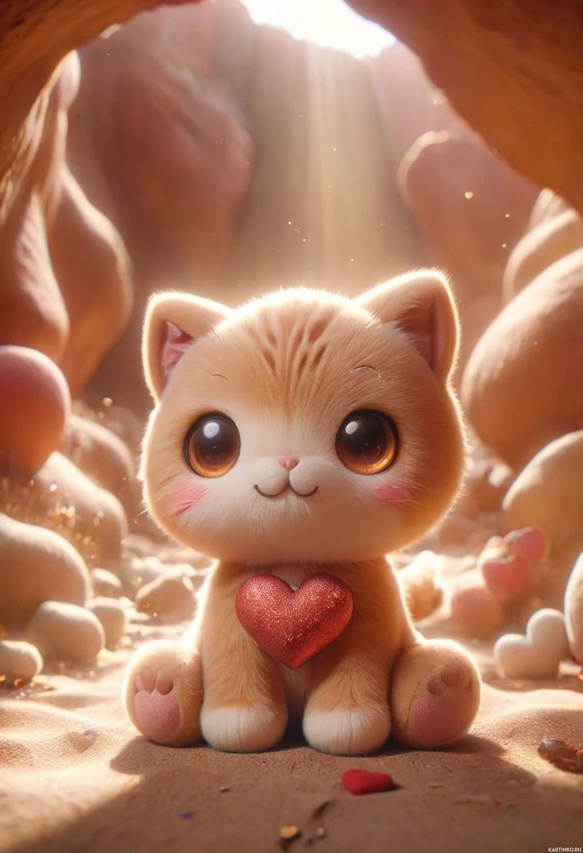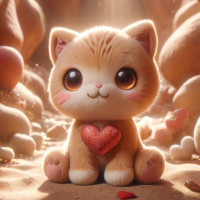 expressive eyes and is wearing a small red heart around its neck. The lighting suggests it might be daytime with the sun coming from above. There are also smaller