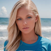 a young woman with long, blonde hair standing on a sandy beach. She is wearing a sleeveless top and appears to be looking directly at the camera with