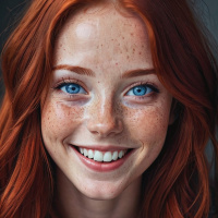 a young woman with red hair. She has visible freckles on her face and is wearing makeup that includes