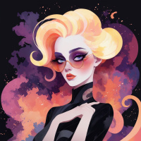 blonde hair, wearing glasses. She is dressed in a black and white outfit that has a sleek and