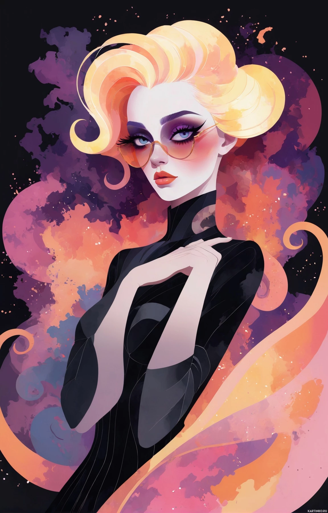 a small object. Her expression is calm and composed. The background of the image is vibrant and filled with a blend of purple, pink, and blue hues that create