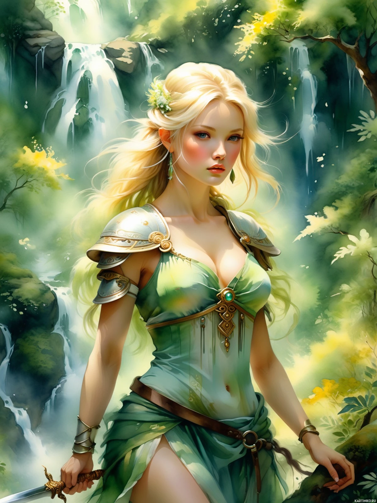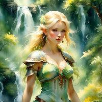 a touch of nature or fantasy to her appearance. Her expression appears serious, and she is standing in front of a backdrop that includes waterfalls and lush vegetation, enhancing