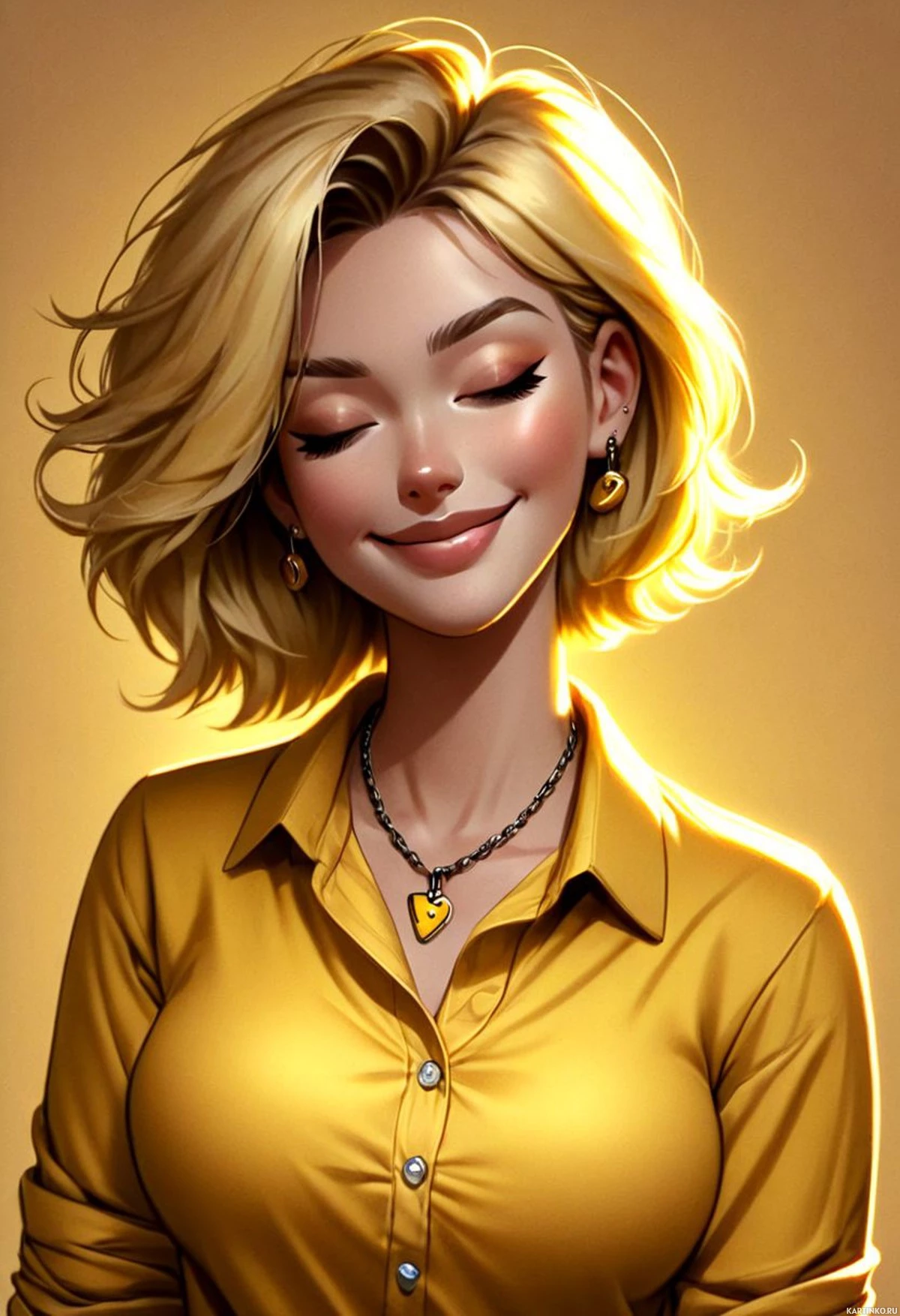 yellow top with a collar that suggests a formal style. There's a warm
