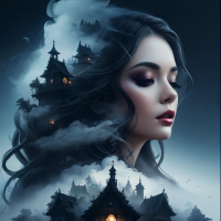 dark hair and is adorned with makeup that highlights her features. To the right of the character's face, there is an illustrated scene featuring a castle-like structure on a cliff or outcrop in