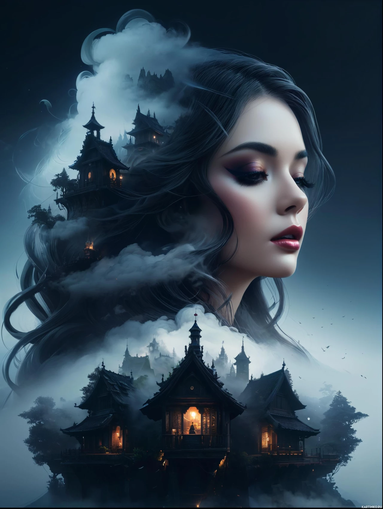 a lit lantern visible through the windows. The overall style of the image combines realistic portraiture with fantasy elements to create an artistic and imaginative scene.