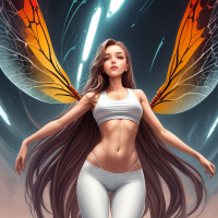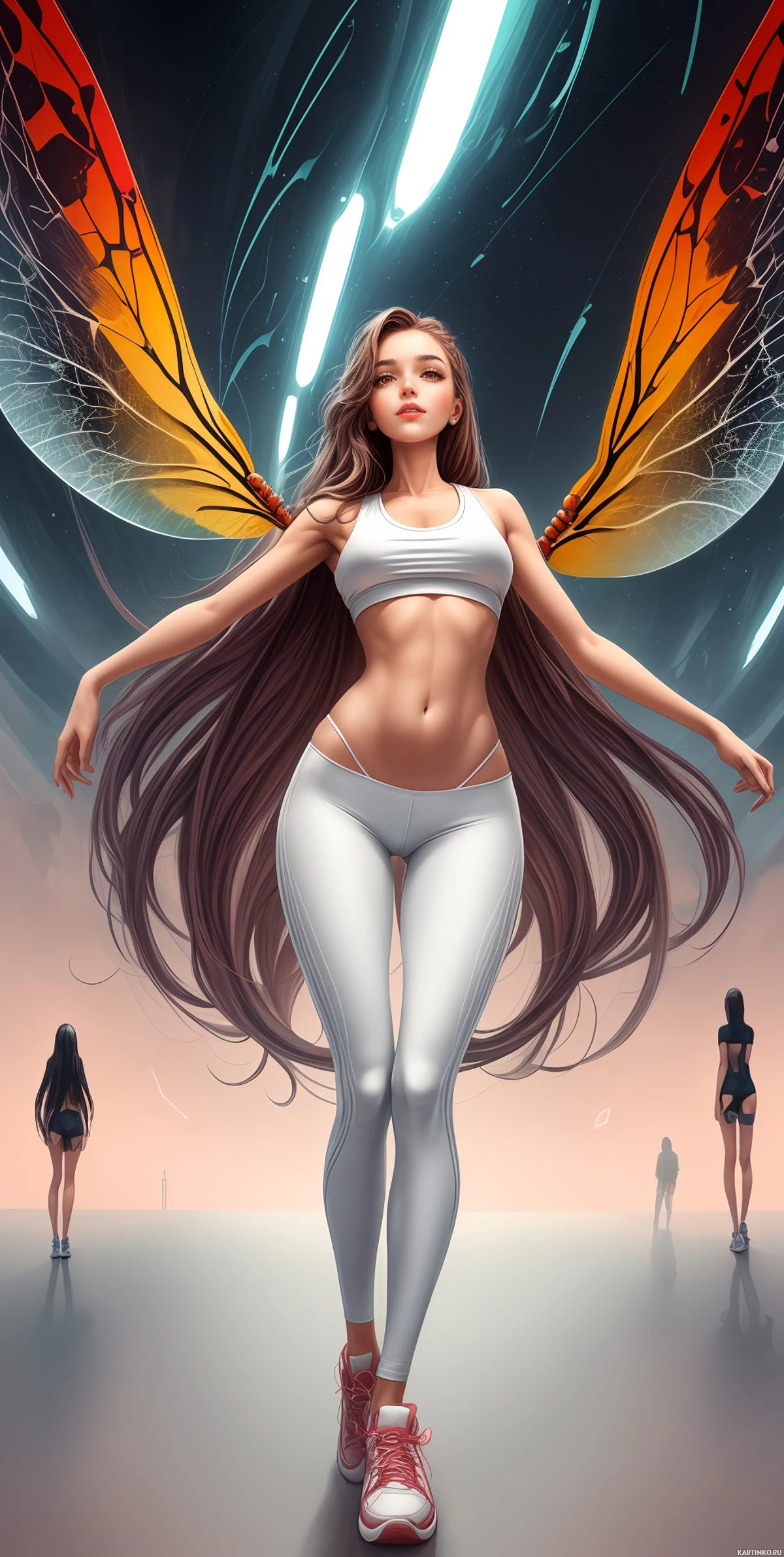 The image portrays a digitally rendered figure that resembles a woman with the lower body of a butterfly. She has long, flowing hair and is wearing revealing attire. Two other figures are present in the background, appearing to be watching or observing her. The scene has an ethereal quality with