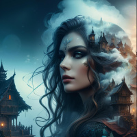 a warm glow over the scene. Below her head are floating clouds that give the impression of mist or smoke. The landscape includes silhouettes of castle-like structures and various other fantasy elements like spires and chimneys, which contribute to