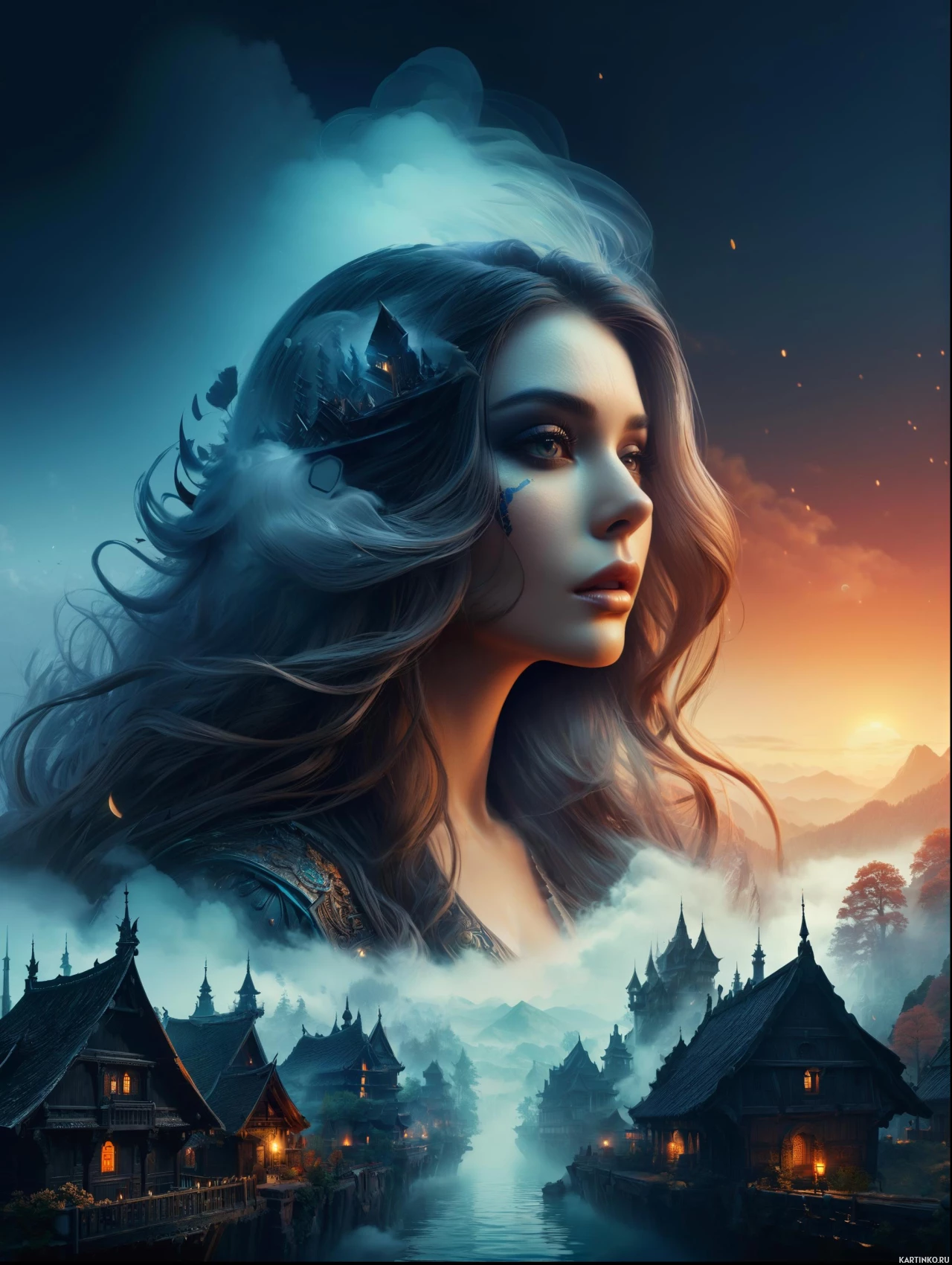 The image depicts a fantasy scene with