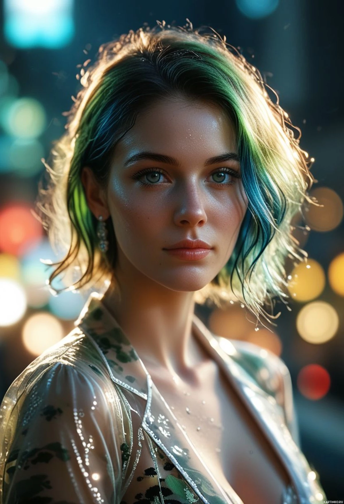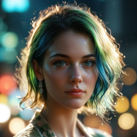 vibrant hair with multiple shades of blue and green, which suggests she might have dyed her hair in such colors. Her makeup is elegant, with