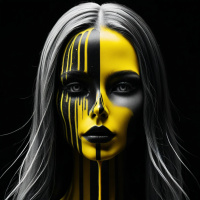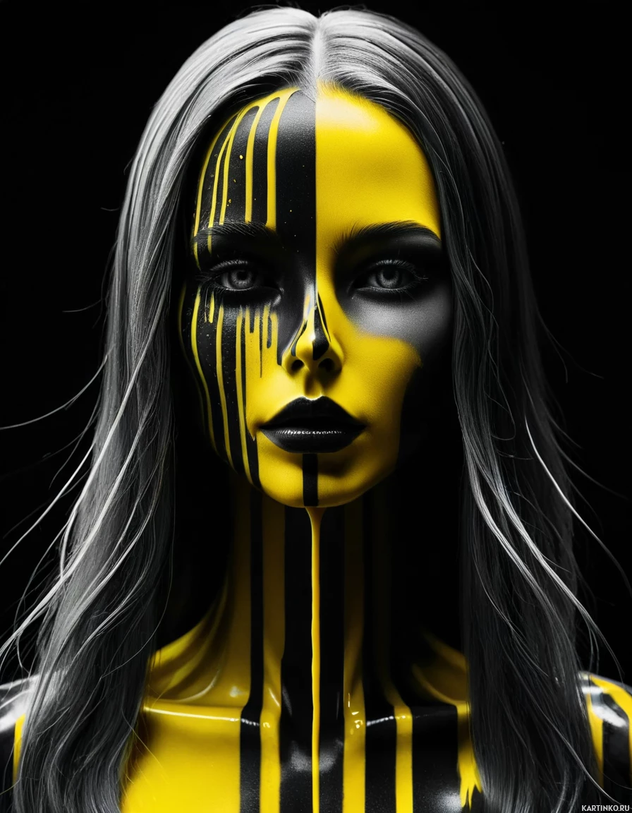 yellow paint or makeup applied in an abstract manner, resembling splatters or drips. The paint or makeup creates