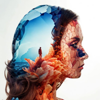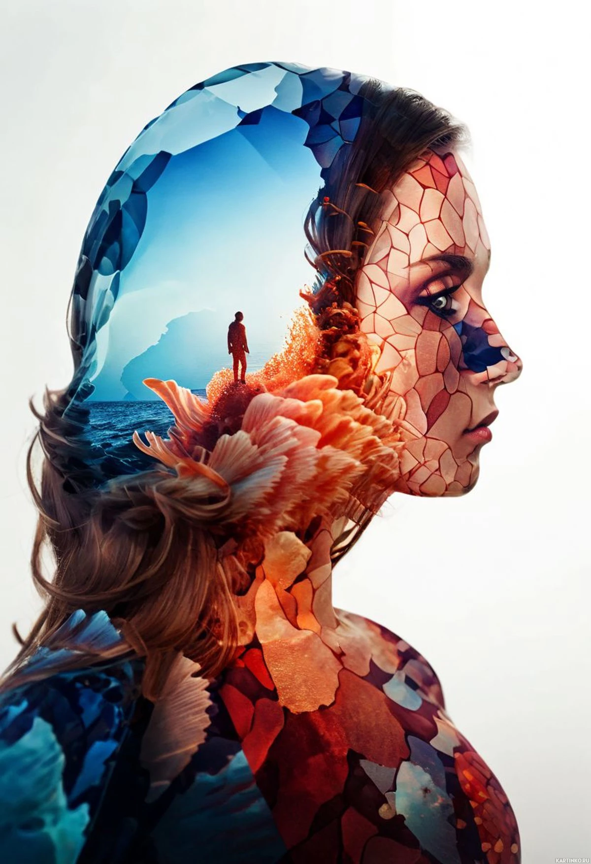 a serene expression. The artwork has an overall theme of nature, transformation, and perhaps adventure or exploration. The use of vibrant colors and the fantastical elements add to the surreal quality of the image.