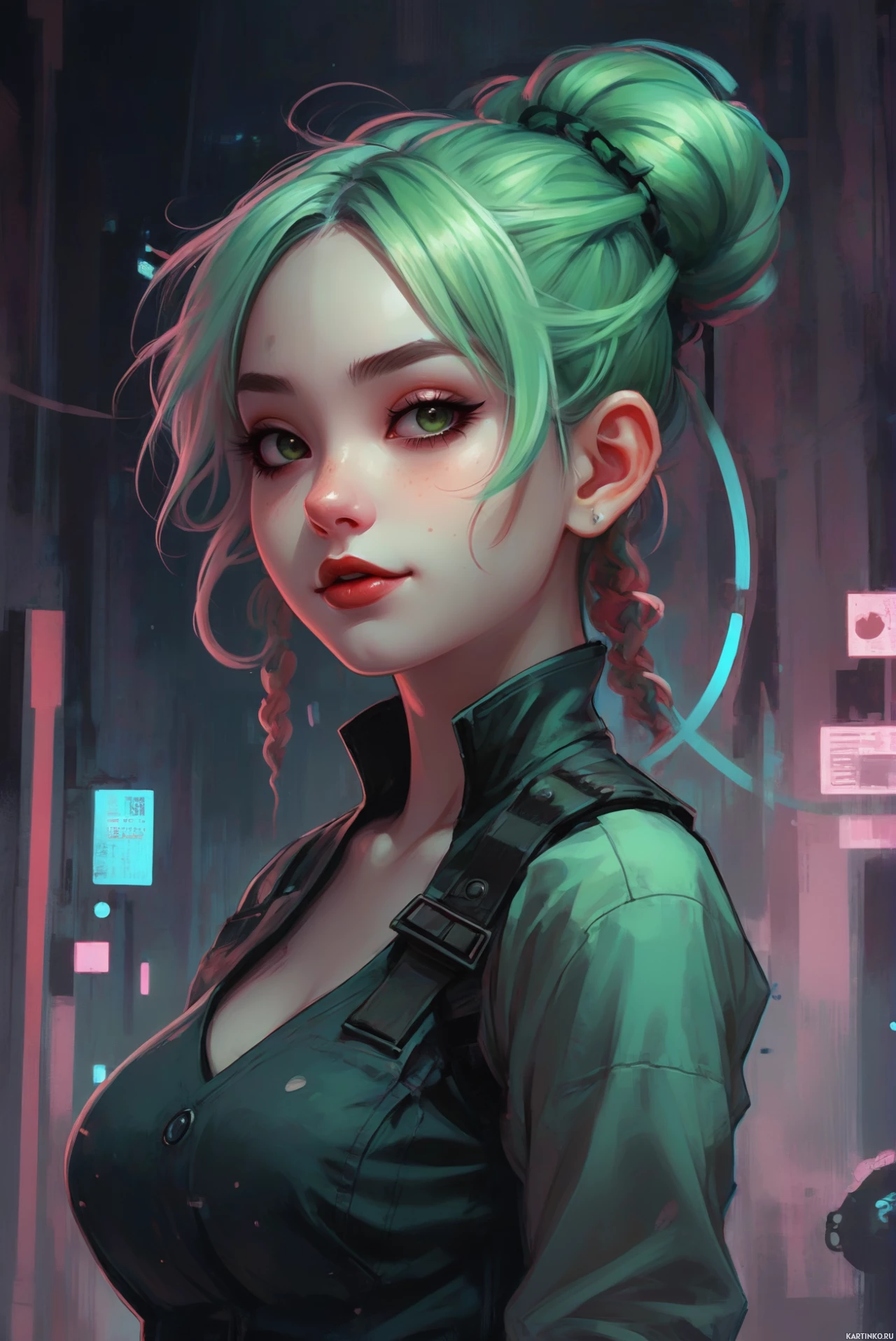 neon lights and electronic components that suggest a high-tech setting. The character is depicted in a three-quarter view, allowing a clear profile of her face and upper body.