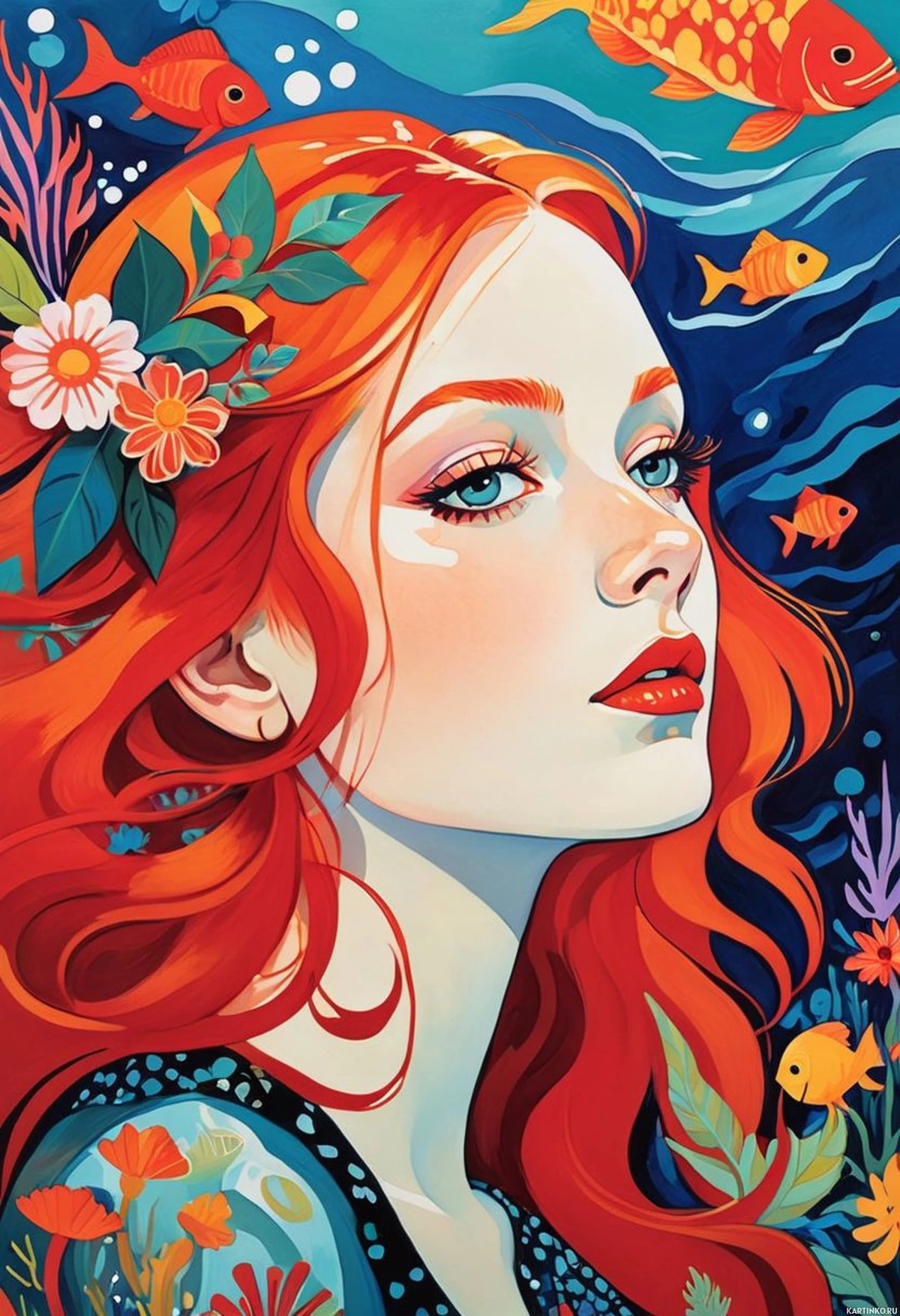 different types of fish, which seem to be floating around her as if drawn by her presence. The background is a deep blue-green oceanic scene, possibly suggesting