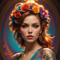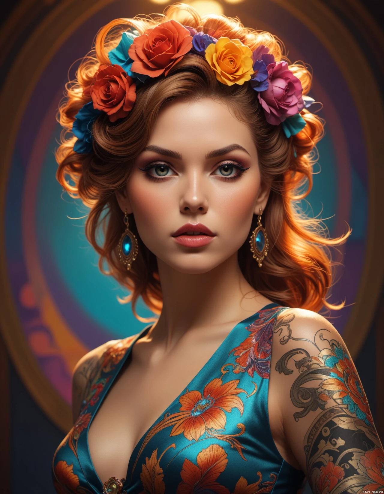 green eyes that add to her captivating appearance. On her head, she wears a vibrant