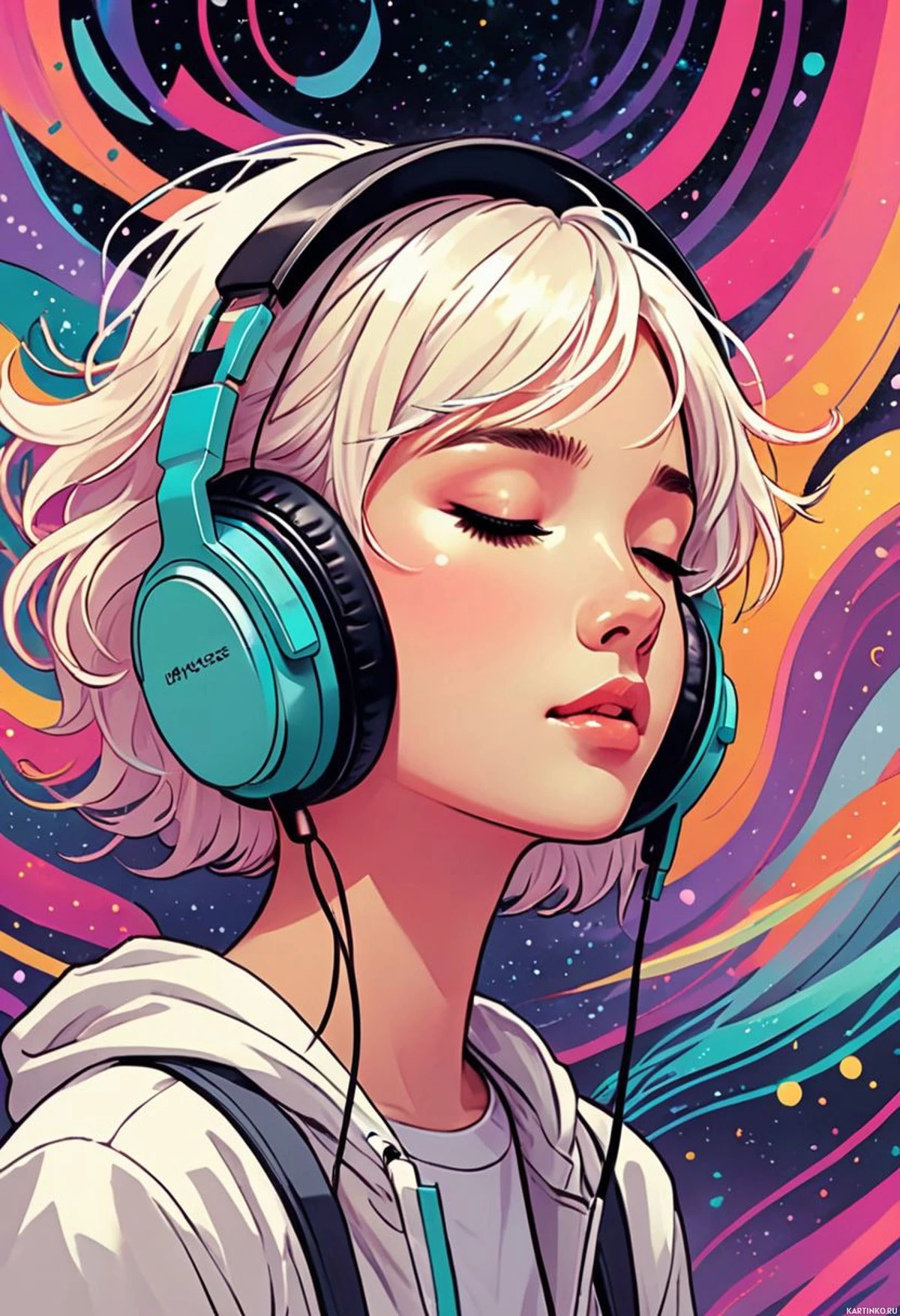 a young woman with closed eyes, wearing headphones over her white hair. She has an elegant and serene expression, suggesting she might be deeply immersed in listening to music or enjoying some form of