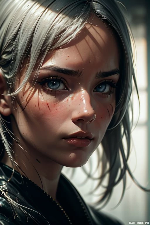 white hair and striking blue eyes. The character is wearing what appears to be a black