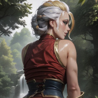 a female character who appears to be a fantasy or video game-inspired depiction. She is seen from behind, standing on what looks like