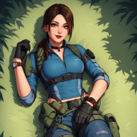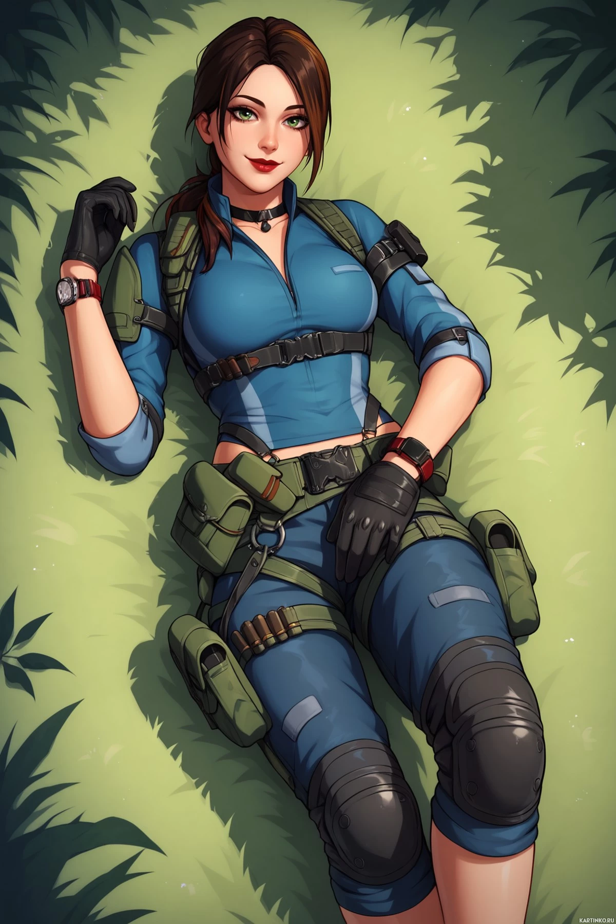 a female character lying on her back. She has an athletic build and is wearing tactical gear, including a blue