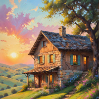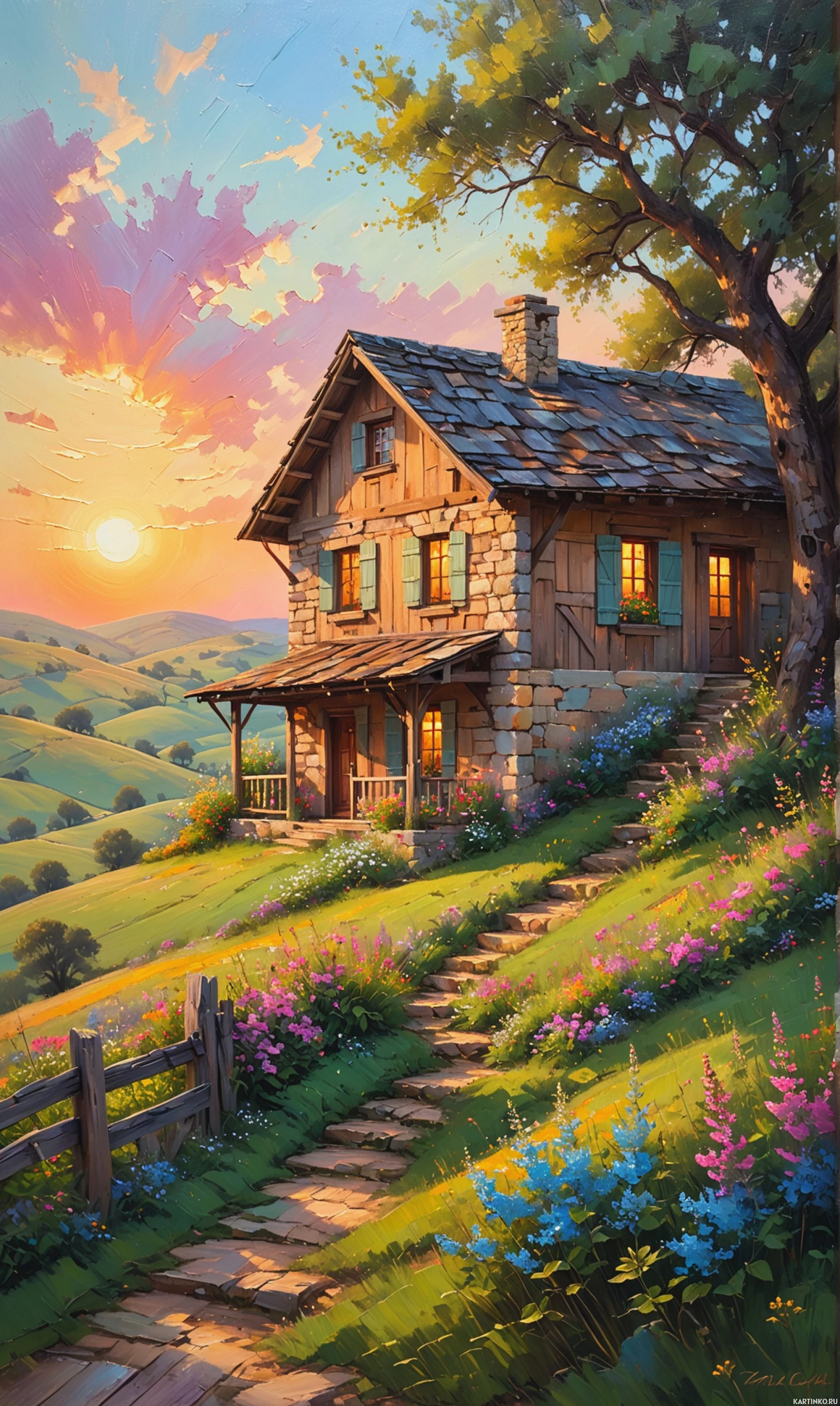 a clear sky. The sun is partially obscured by the clouds, suggesting either dawn or dusk. A winding path leads up to the entrance of the house, inviting viewers into this idyllic