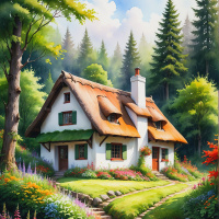 colorful blossoms leading to the house. A small stream flows gently on the left side of the property, adding to