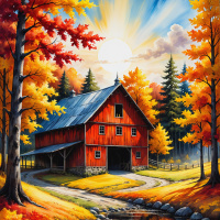 the vivid colors of the leaves. Above the scene, the sky is painted in warm tones with the sun casting long shadows on the ground, suggesting it's either dawn or dusk. The overall mood of the image is peaceful and idyllic, capturing the essence of a traditional countryside setting during autumn.