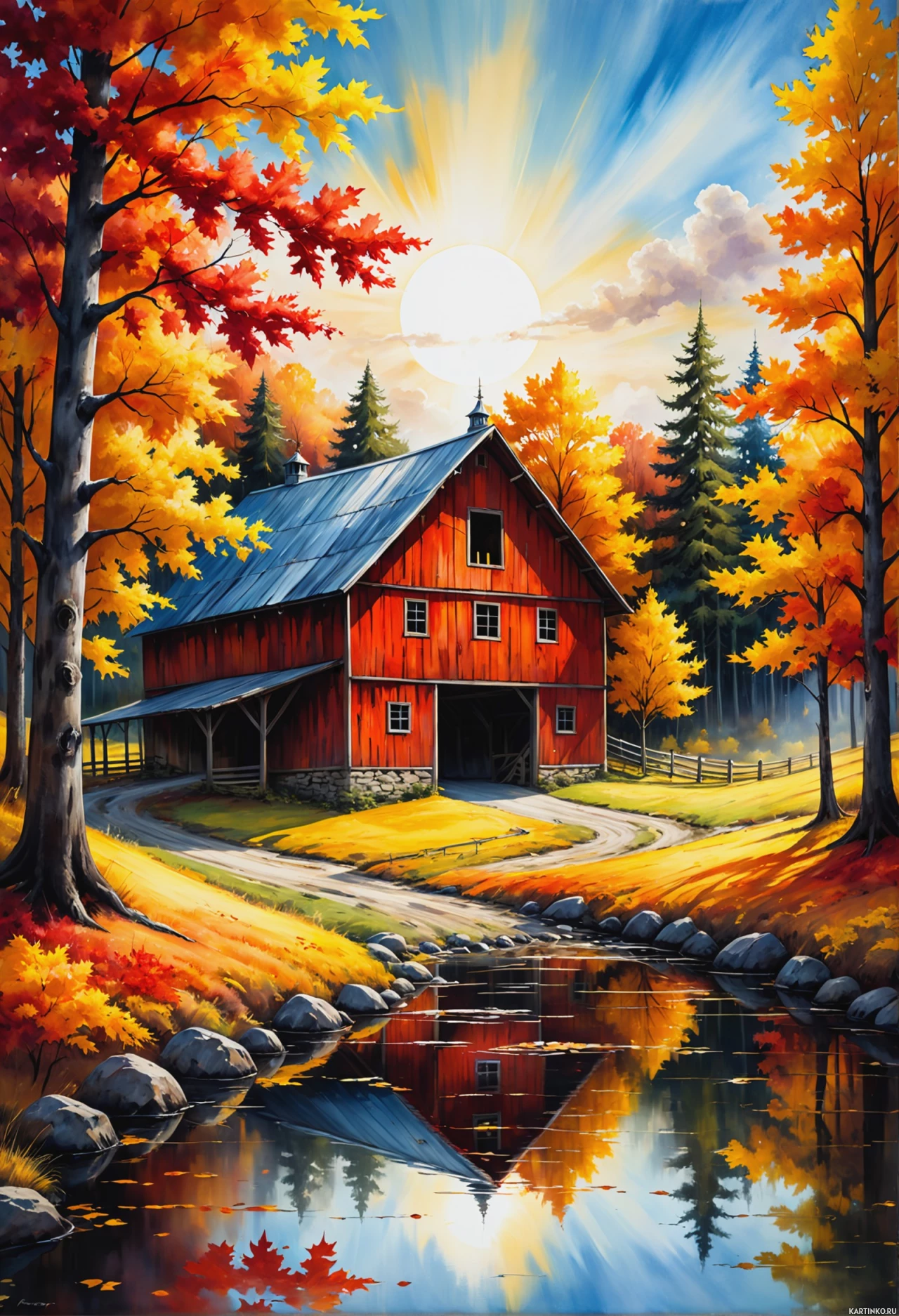 autumn scene. In the foreground, there is a clear water body reflecting the vibrant