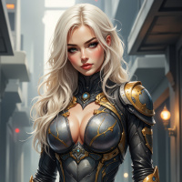 intricate designs, including what appear to be circuit-like patterns and a chest piece with a gem or emblem embedded in it. The overall aesthetic of the image combines elements of realism for the figure with