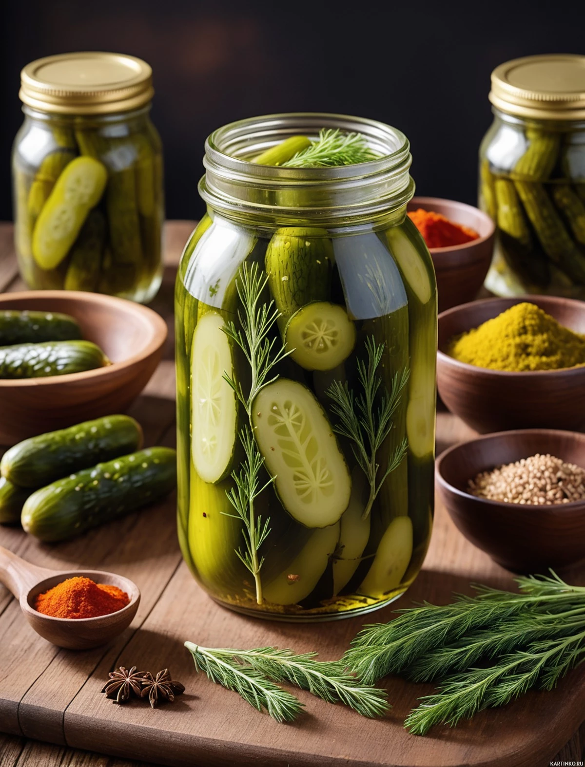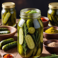 glass jar filled with green pickled cucumbers and is garnished with sprigs of rosemary. Surrounding the jar are various other jars and bottles containing