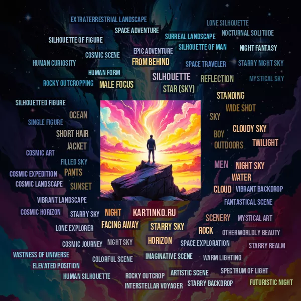 The image depicts a fantastical and vibrant scene. In the foreground, there is a silhouette of a figure standing on a rocky outcrop at what appears to be either sunrise or sunset, given