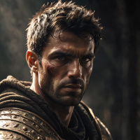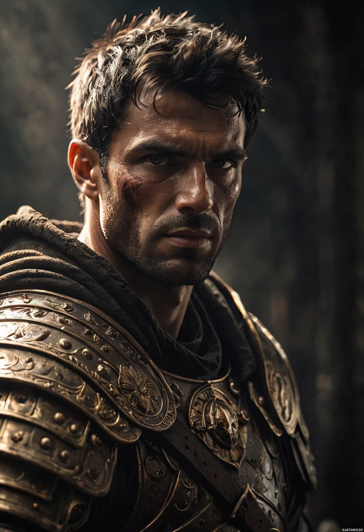 The image features a man dressed in what appears to be ancient Roman or Celtic armor, suggesting he is portraying a warrior. His expression is serious and intense, with his eyes looking directly at the viewer. The armor includes