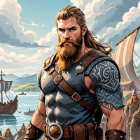 a muscular build, and his attire suggests he is ready for battle. His right hand holds a shield with