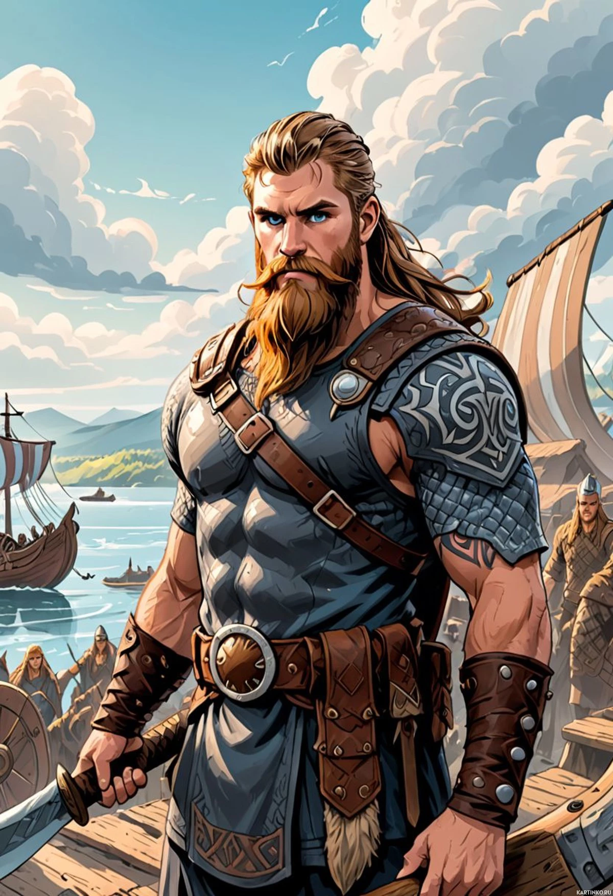 intricate designs, while his left hand rests on the hilt of a sword. The background features a clear blue sky with clouds and a distant view of the ocean horizon, indicating