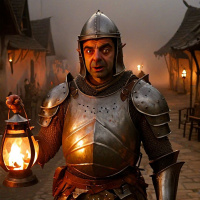 medieval times for lighting during nighttime travel or combat situations. The man's expression is serious and focused, which could indicate he is on a mission or preparing for battle. The setting appears to be an urban street with traditional East Asian architecture in the background, indicating that the scene might be set in a city influenced by or part of the East Asian civilization during that historical period. The juxtaposition of the armored warrior with the modern-looking backdrop creates a stark contrast between the past and present.
