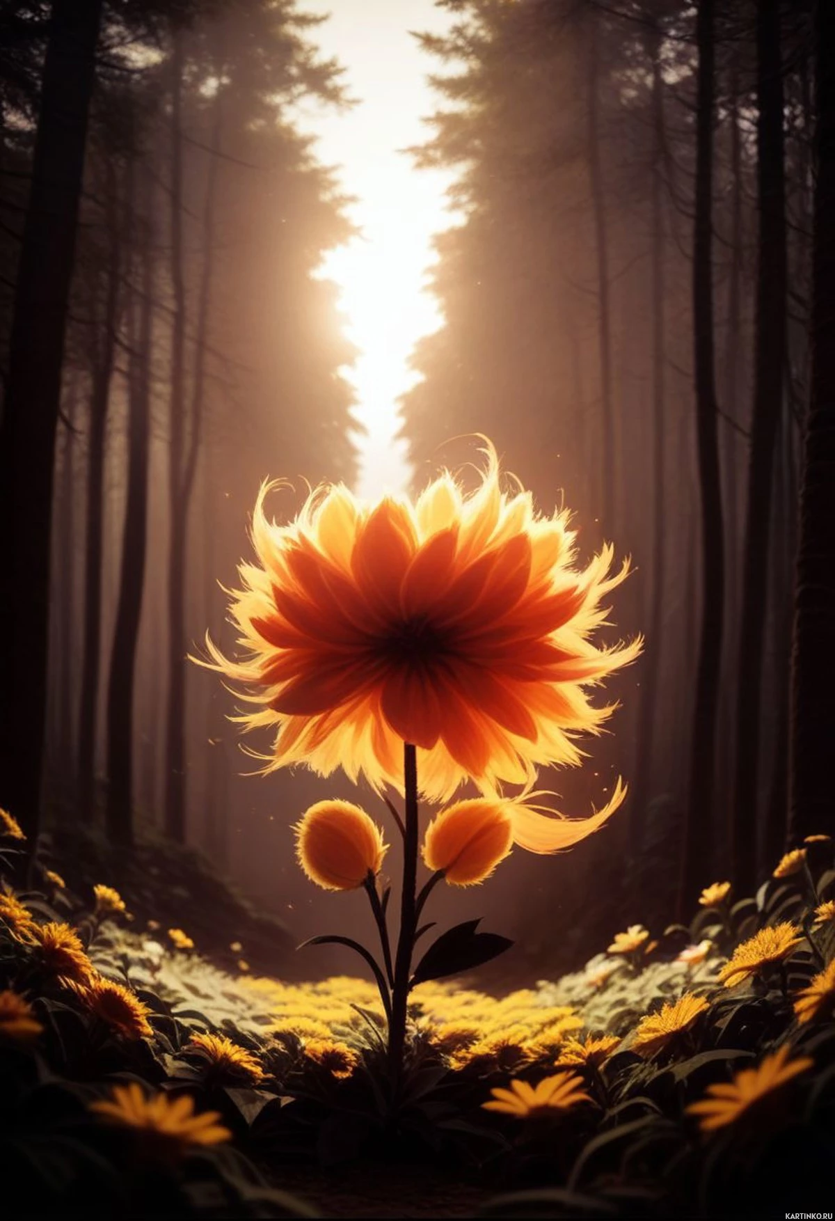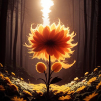 fallen leaves, and there's a subtle glow emanating from behind the sunflower, further emphasizing the warmth it is reflecting. Overall, the image exudes a serene and magical atmosphere, possibly indicating that it's either dusk or dawn when the light is at