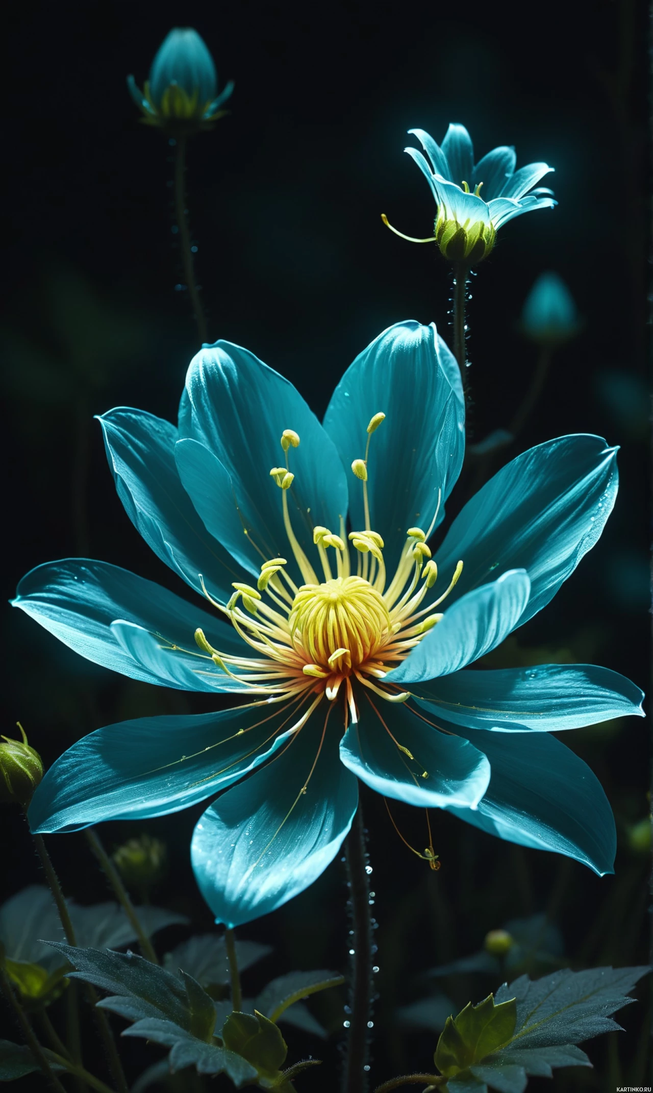 water droplets visible on the petals, which adds a delicate and fresh quality to the image. The overall style of the photograph is artistic, emphasizing the beauty and vibrancy of the flowers.