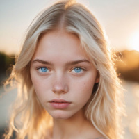 blue eyes with prominent eyeliner and lipstick that gives her lips a full appearance. Her complexion is smooth, and she appears to have subtle contouring around her cheeks and eyes, suggesting