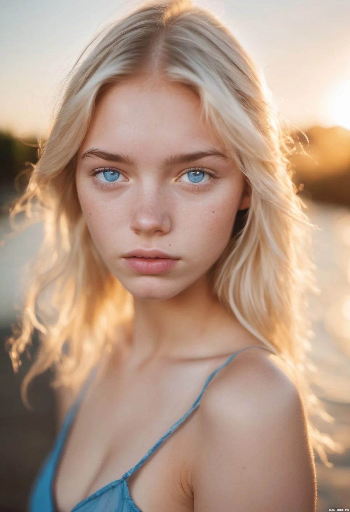 a young woman with fair skin and light blonde hair styled in loose waves. She has striking