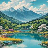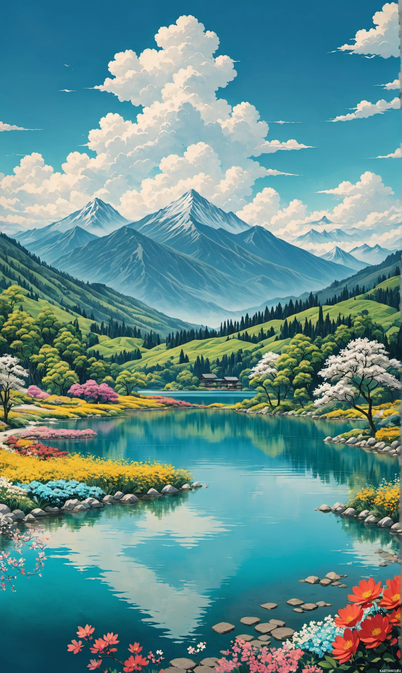 majestic mountains loom in the far background under a bright sun. These elements together create an idyllic setting, evoking the beauty and peacefulness of nature. The colors are vibrant, with the blues of the sky and water contrasting against the greens and browns of the terrain.
