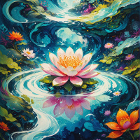 glowing light that emanates from its core. The water surrounding the flower appears to be part of a serene lake or river, which has gentle ripples and