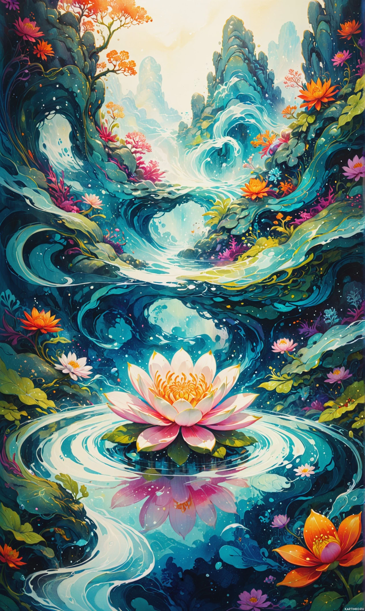 blue hues indicative of depth. The landscape around the lotus is rich with greenery, including trees and shrubs that suggest
