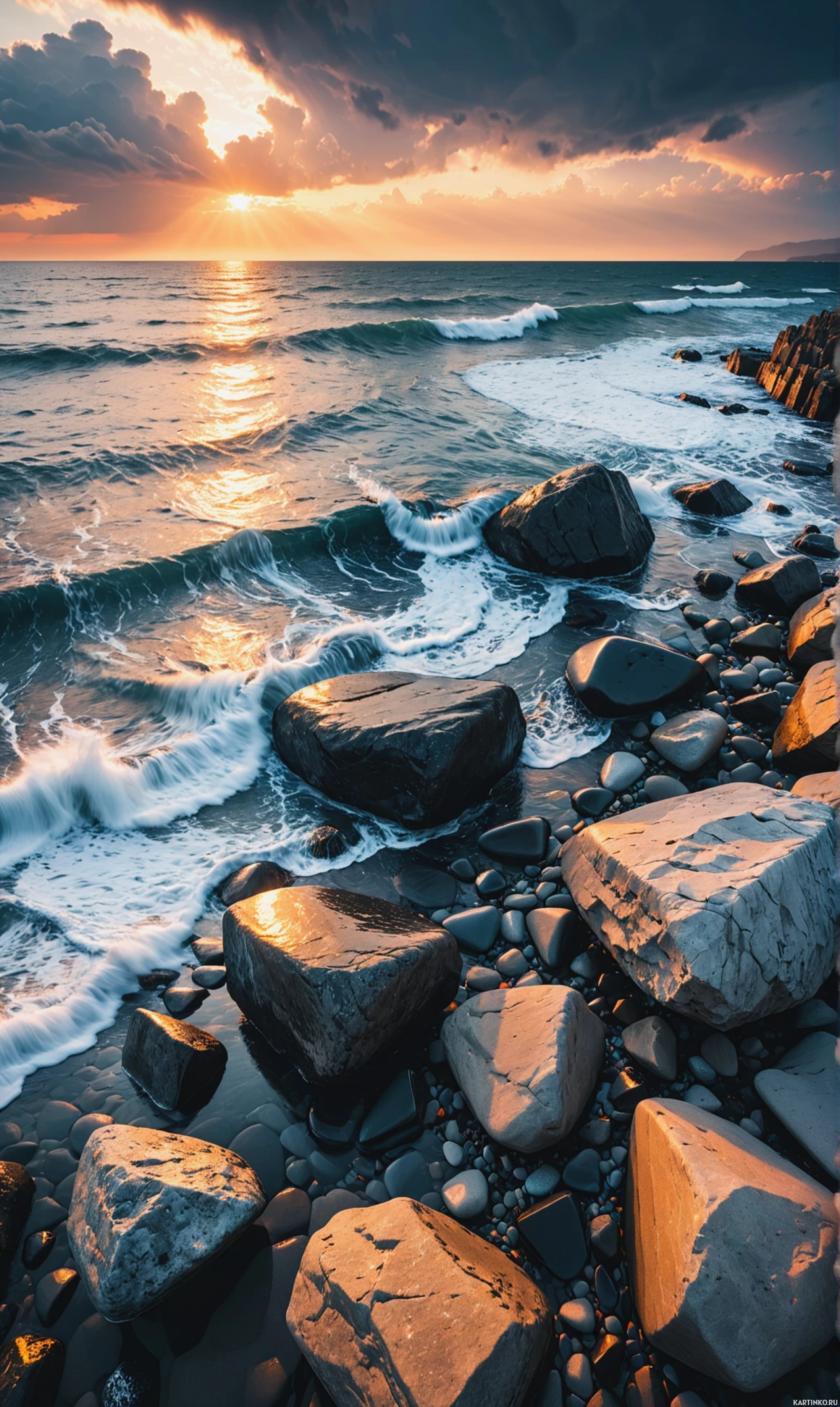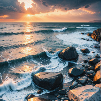 a rocky shoreline where the waves of the sea crash, creating a gentle rhythmic sound. Among these rocks are some larger boulders that provide