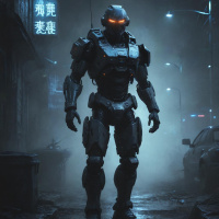 a metallic exoskeleton and a helmet that has visor-like features. It stands on what appears to be a rain-soaked street at night, illuminated by
