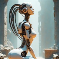 a humanoid robot, which appears to be female based on its human-like features. It is standing in what looks like an ancient or