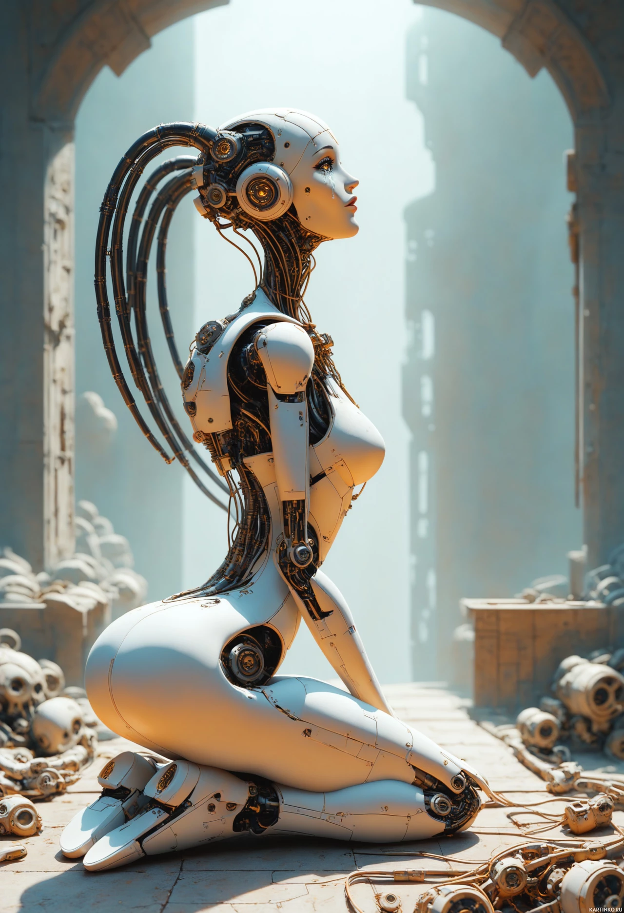 futuristic setting with archways and columns resembling ruins. The robot's design includes intricate details such as mechanical components visible through the skin, suggesting