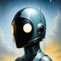 humanoid figure with a large head and a metallic body. It features an array of futuristic gadgets, including what appear to be visors or eye pieces on the forehead, along with what might be